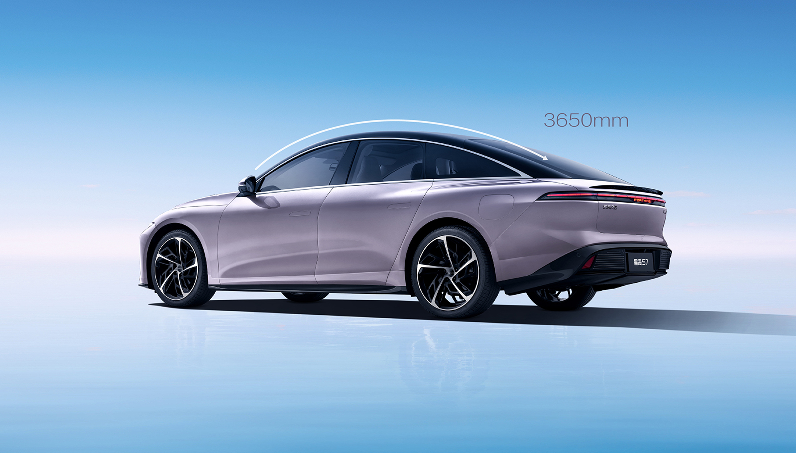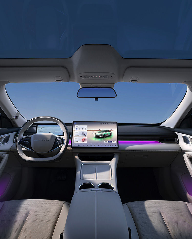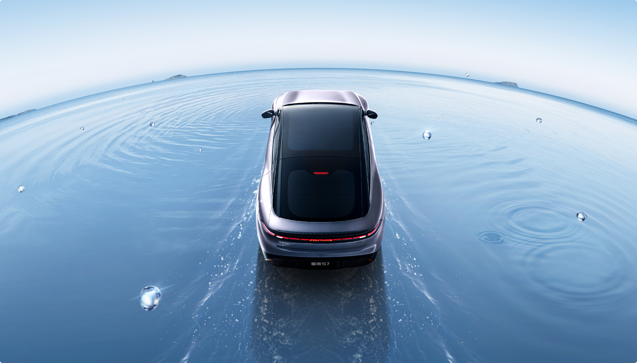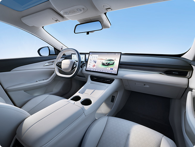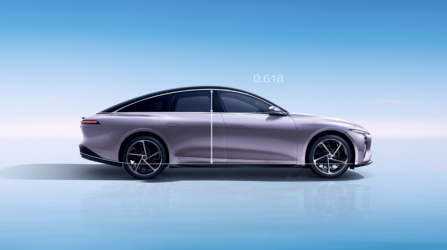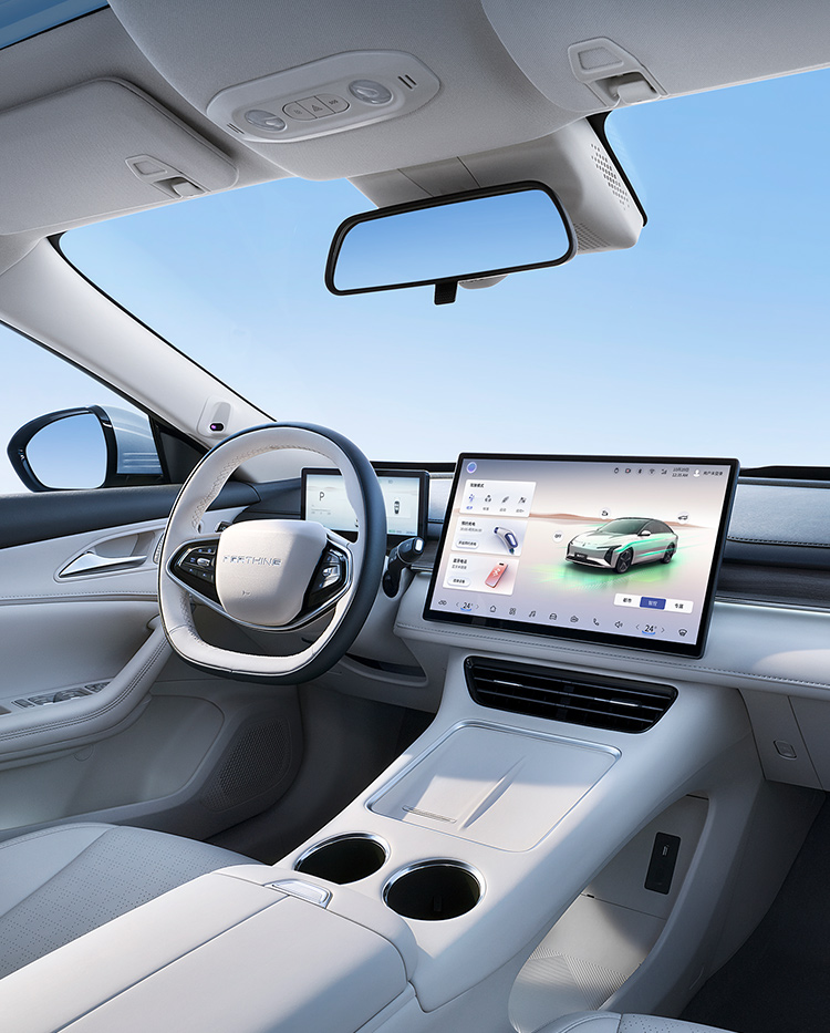 灵感来自茶卡盐湖,完美倒映天空景色与自然景观,清澈透亮;线条流畅而简约,宛如天空与地面交界处那柔和而无形的界线,既是致敬自然之美,又彰显了车辆本身的未来感与科技感。
