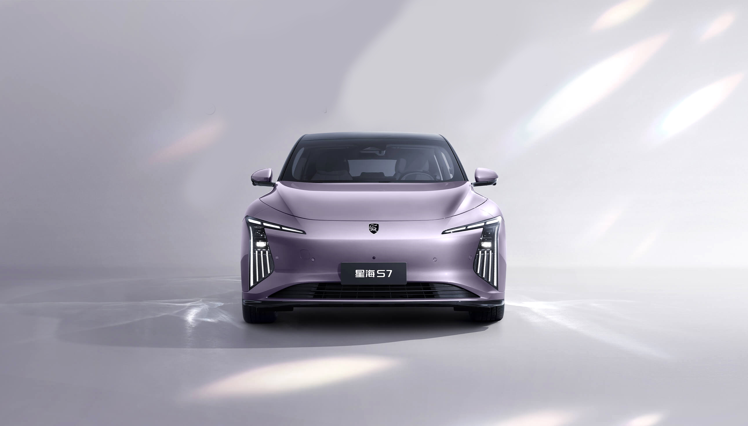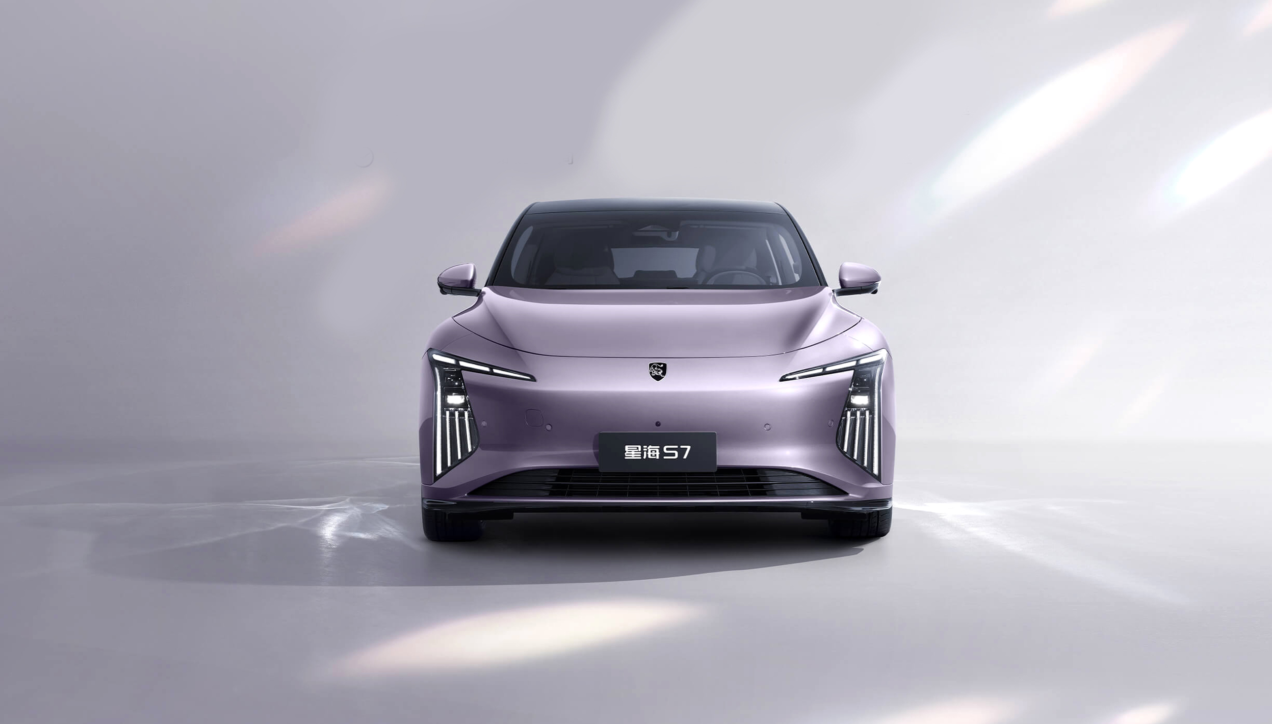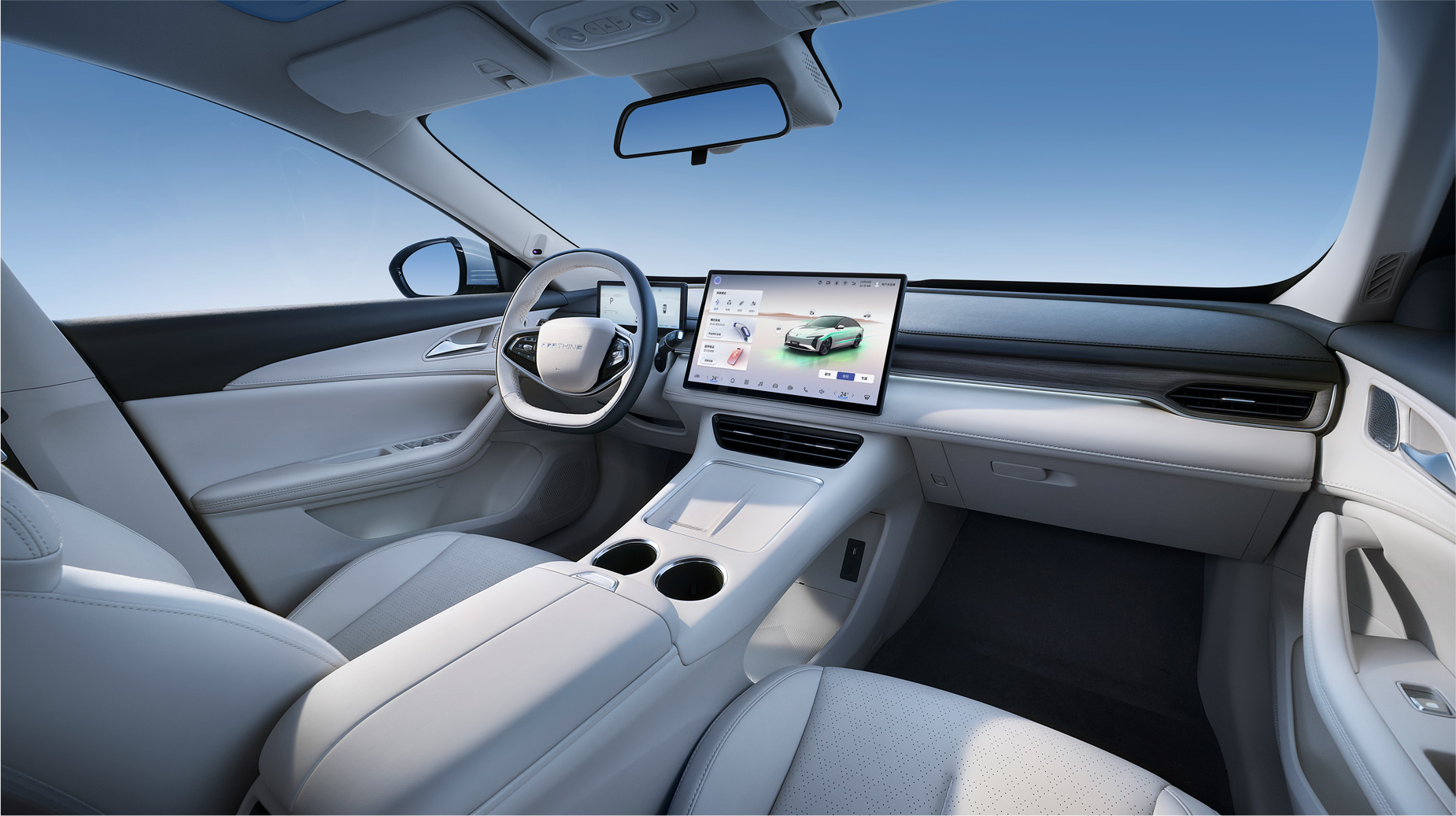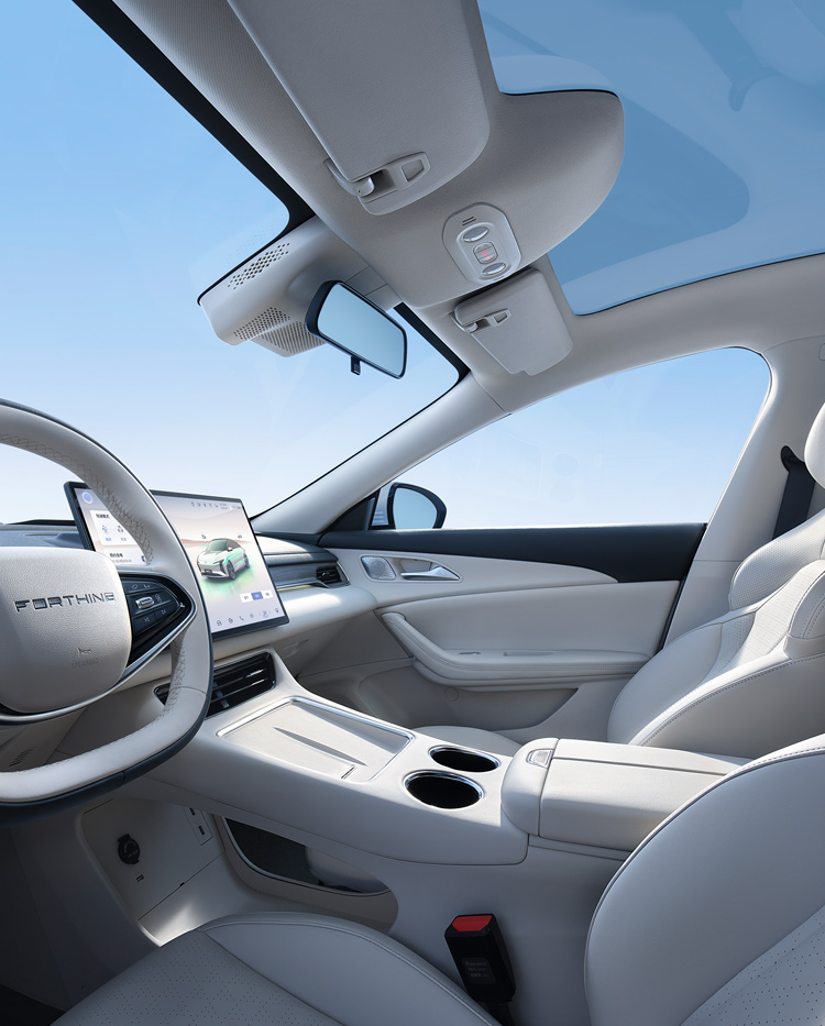 灵感来自茶卡盐湖,完美倒映天空景色与自然景观,清澈透亮;线条流畅而简约,宛如天空与地面交界处那柔和而无形的界线,既是致敬自然之美,又彰显了车辆本身的未来感与科技感。