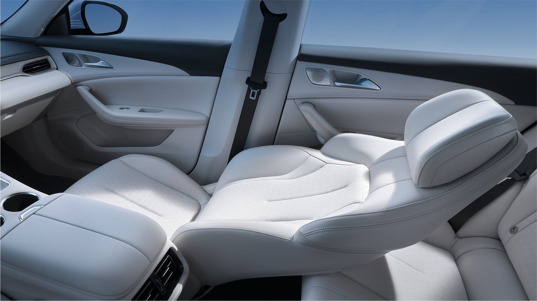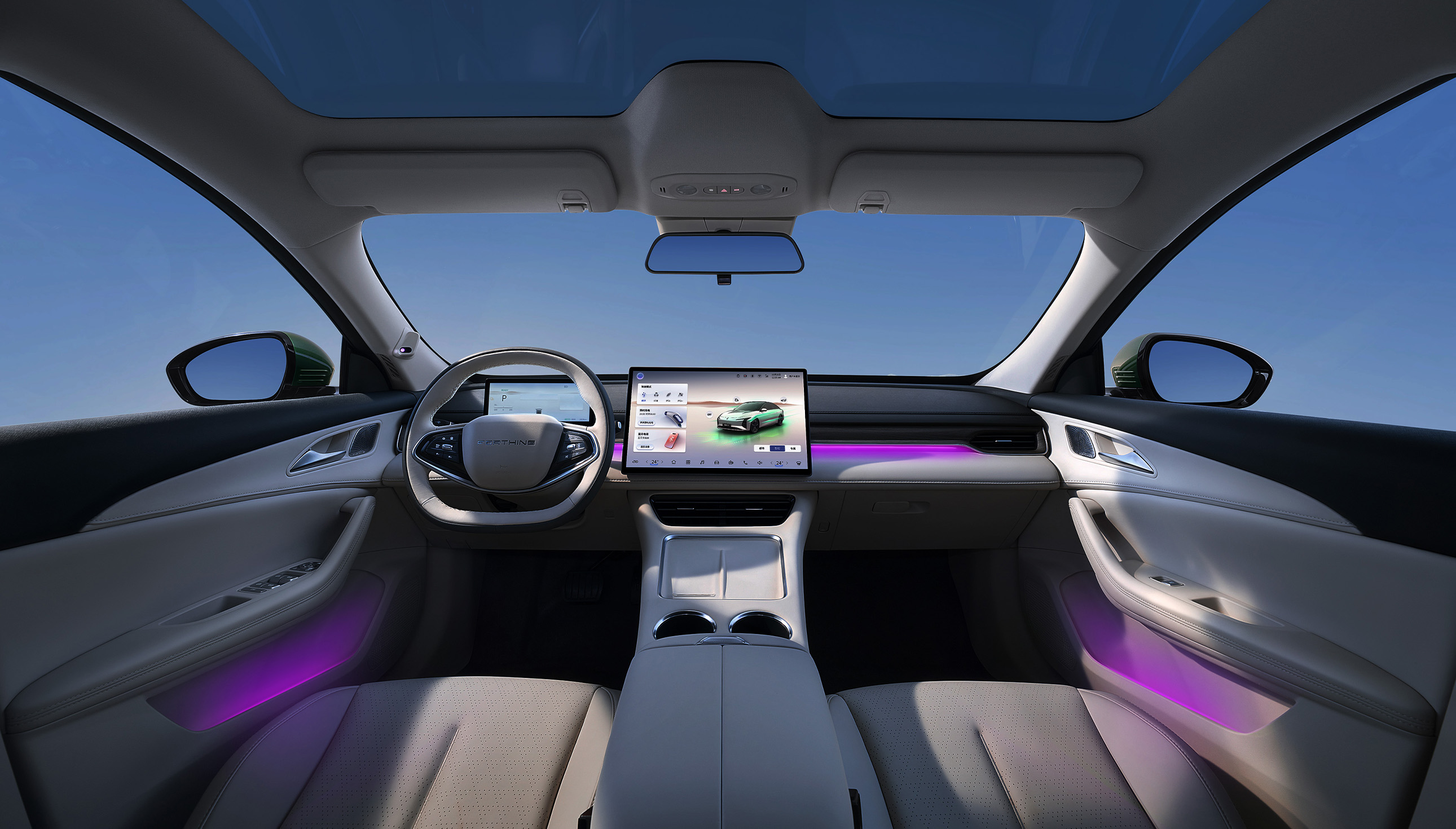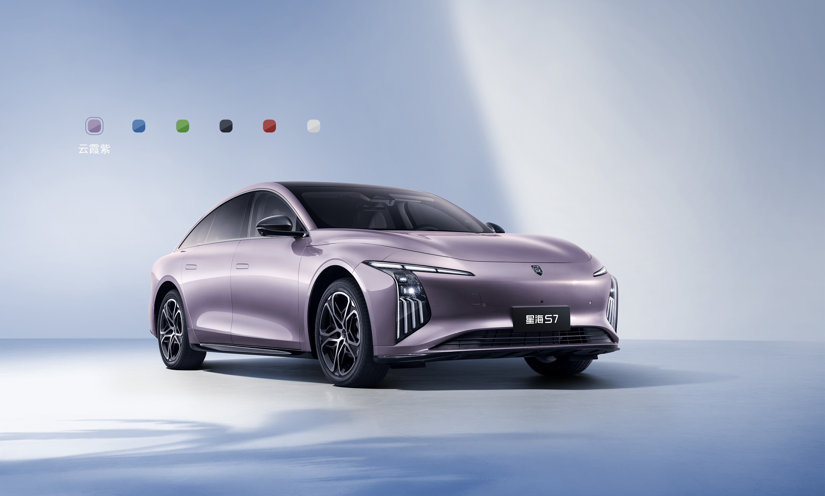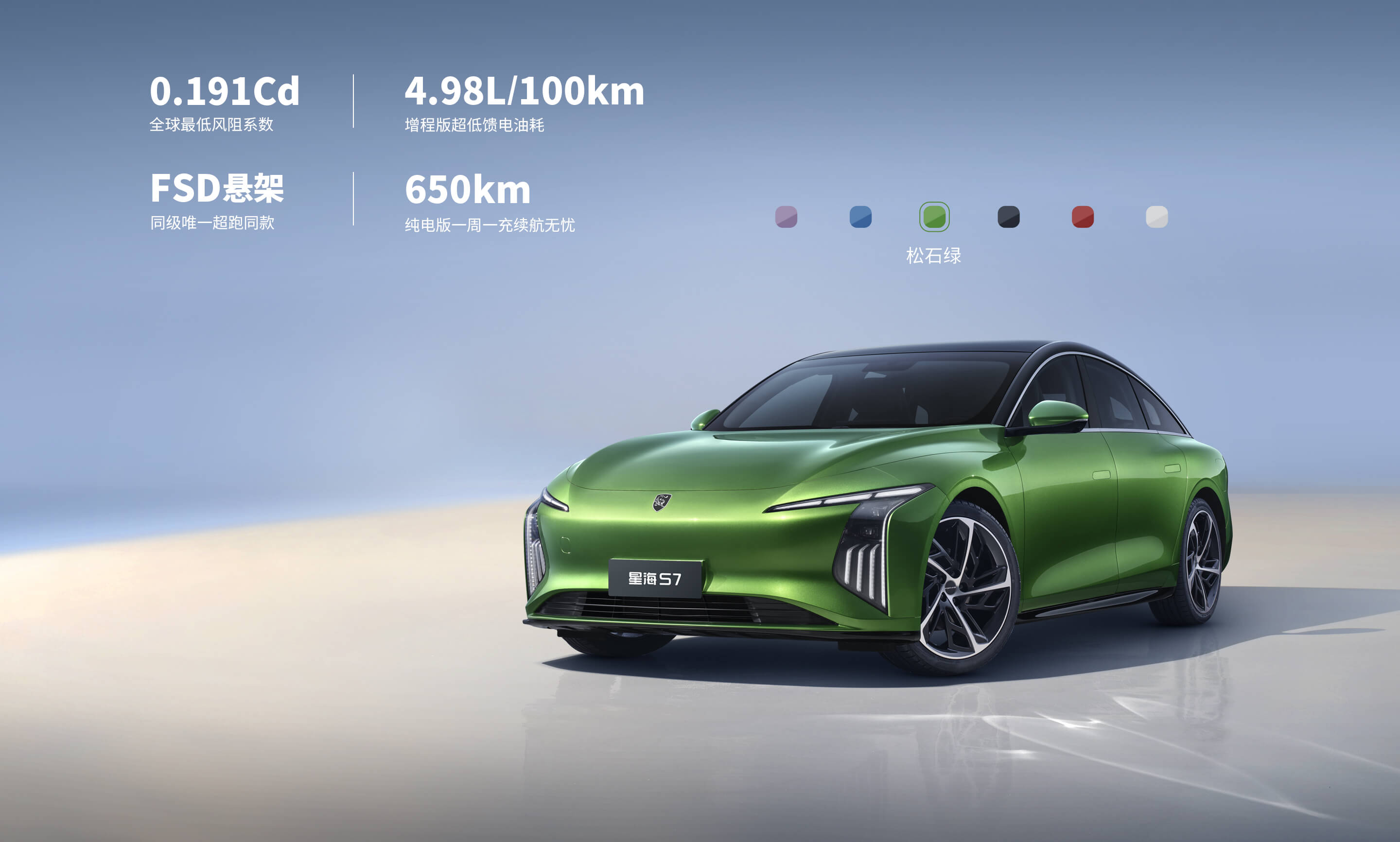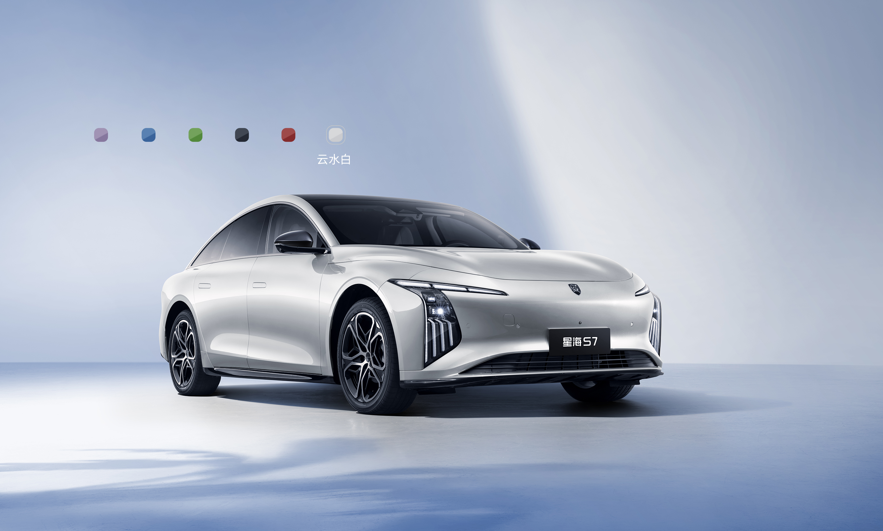 灵感来自茶卡盐湖,完美倒映天空景色与自然景观,清澈透亮;线条流畅而简约,宛如天空与地面交界处那柔和而无形的界线,既是致敬自然之美,又彰显了车辆本身的未来感与科技感。