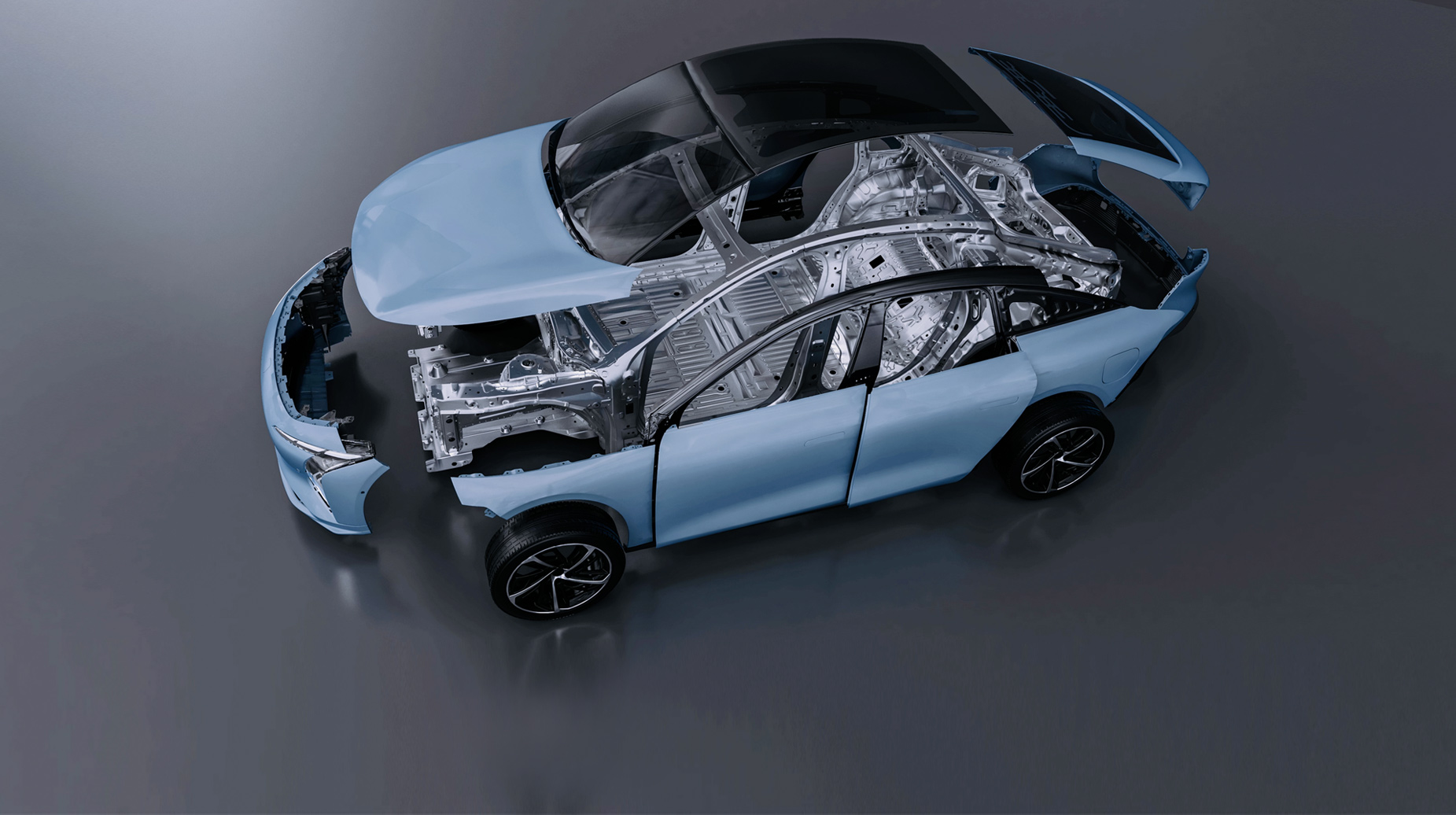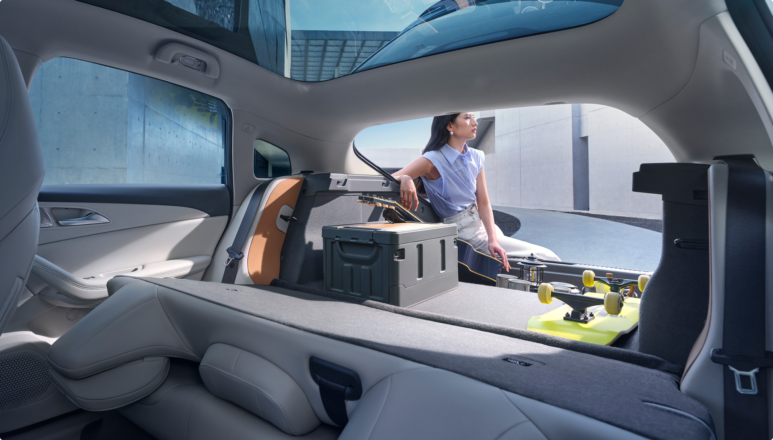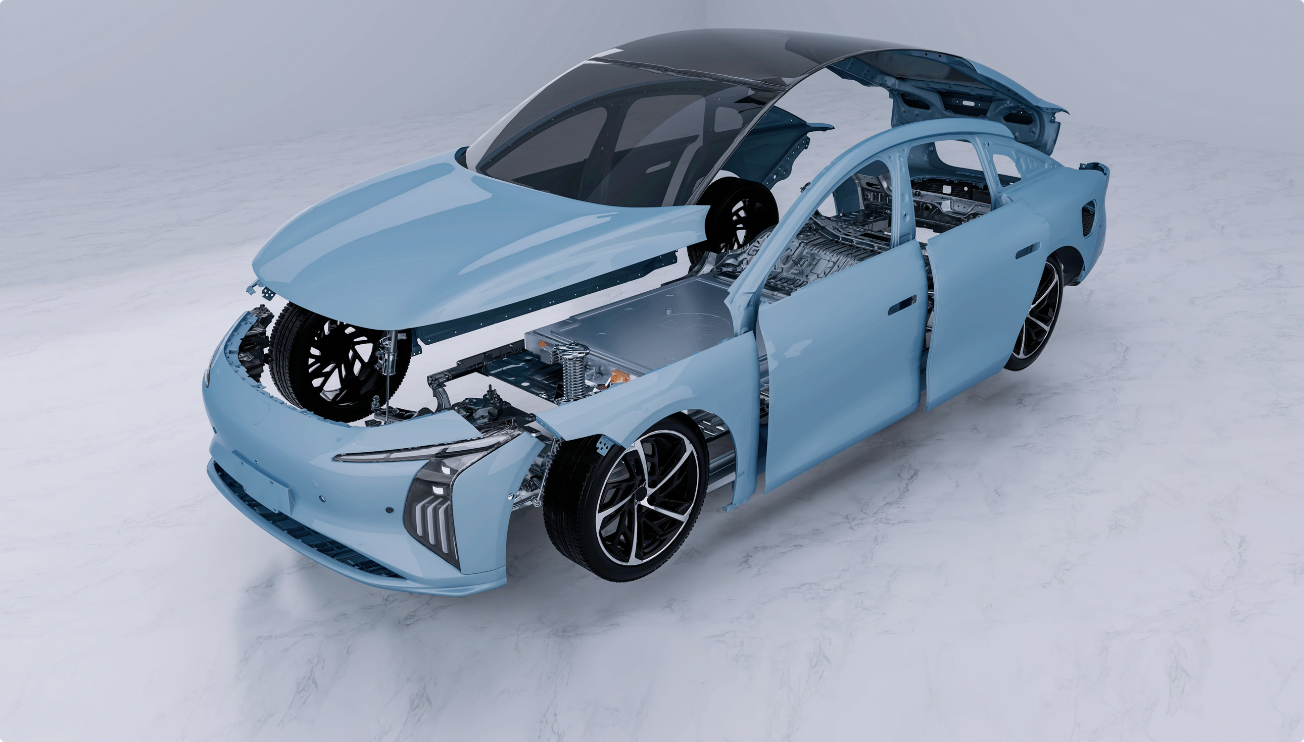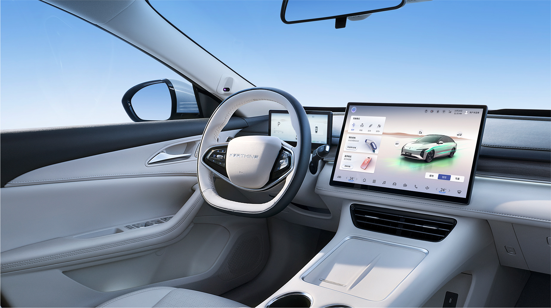 灵感来自茶卡盐湖,完美倒映天空景色与自然景观,清澈透亮;线条流畅而简约,宛如天空与地面交界处那柔和而无形的界线,既是致敬自然之美,又彰显了车辆本身的未来感与科技感。