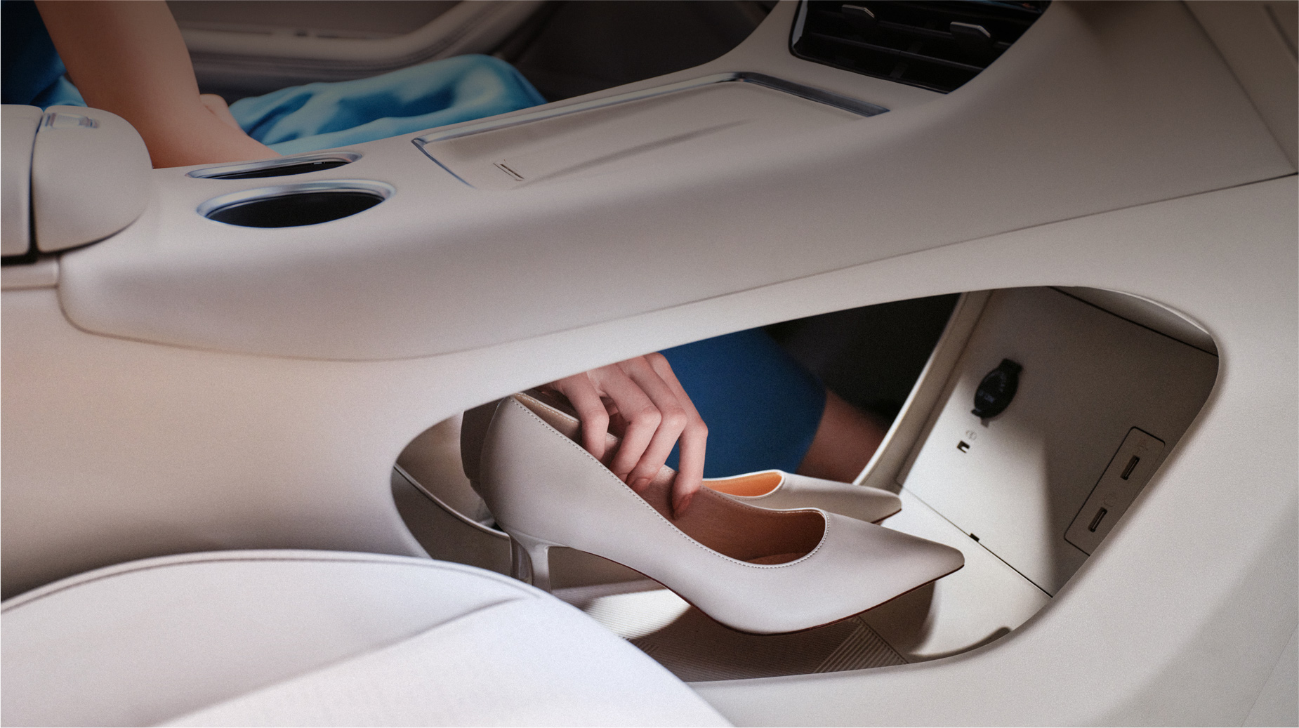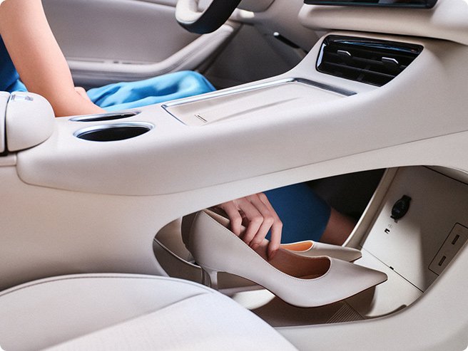 中控区特别设计镂空式储物区,可容纳包、鞋等物品,极大增加了车内储物空间。