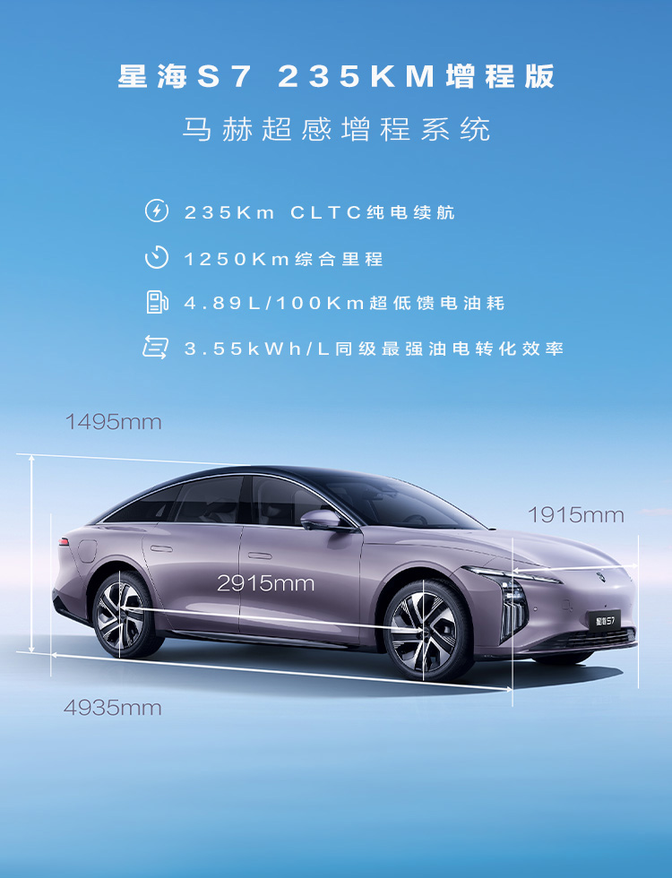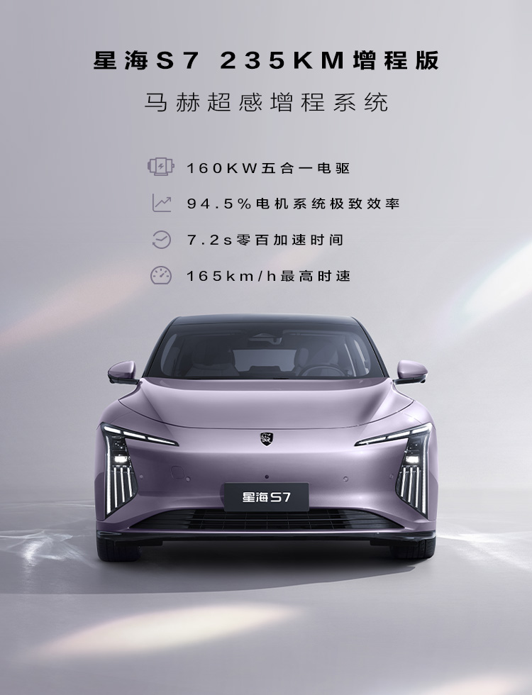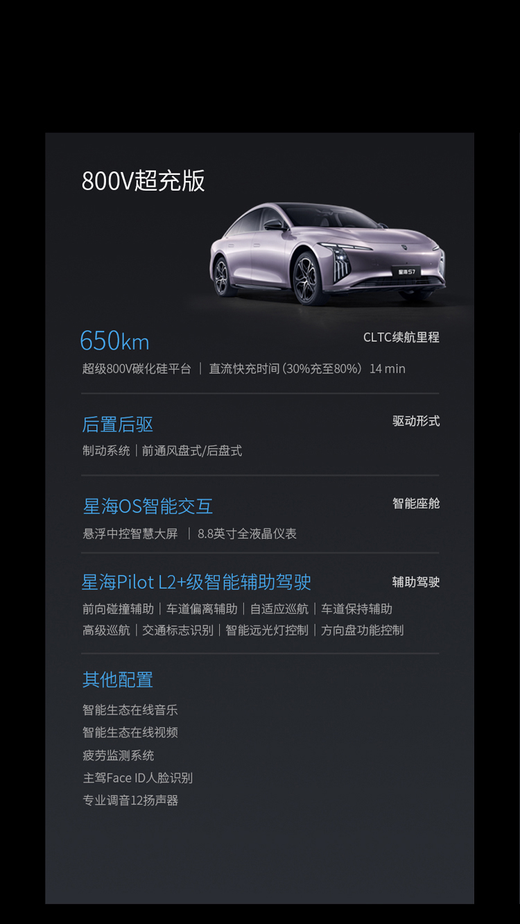 百公里耗电量低至11.6kWh/100km,高效出行,一省再省,极致的电耗主要得益于星海S7搭载的8层扁线电机技术,可实现电机系统94.5%的极致效率,荣获中国“能效之星”权威认证。