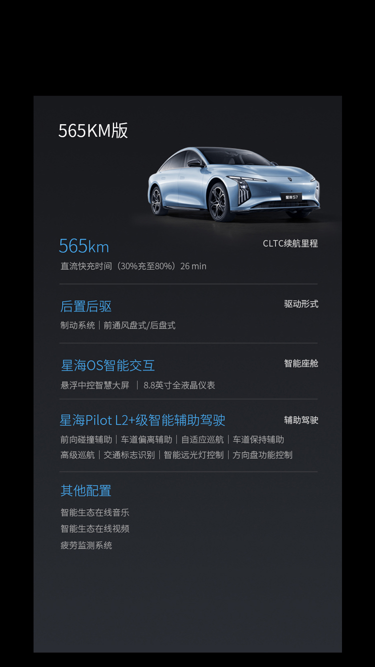 650km/555 km同级最长续航,适行全路况,续航不虚标,在星海S7万里长测活动中,于真实道路环境中得到了充分验证。