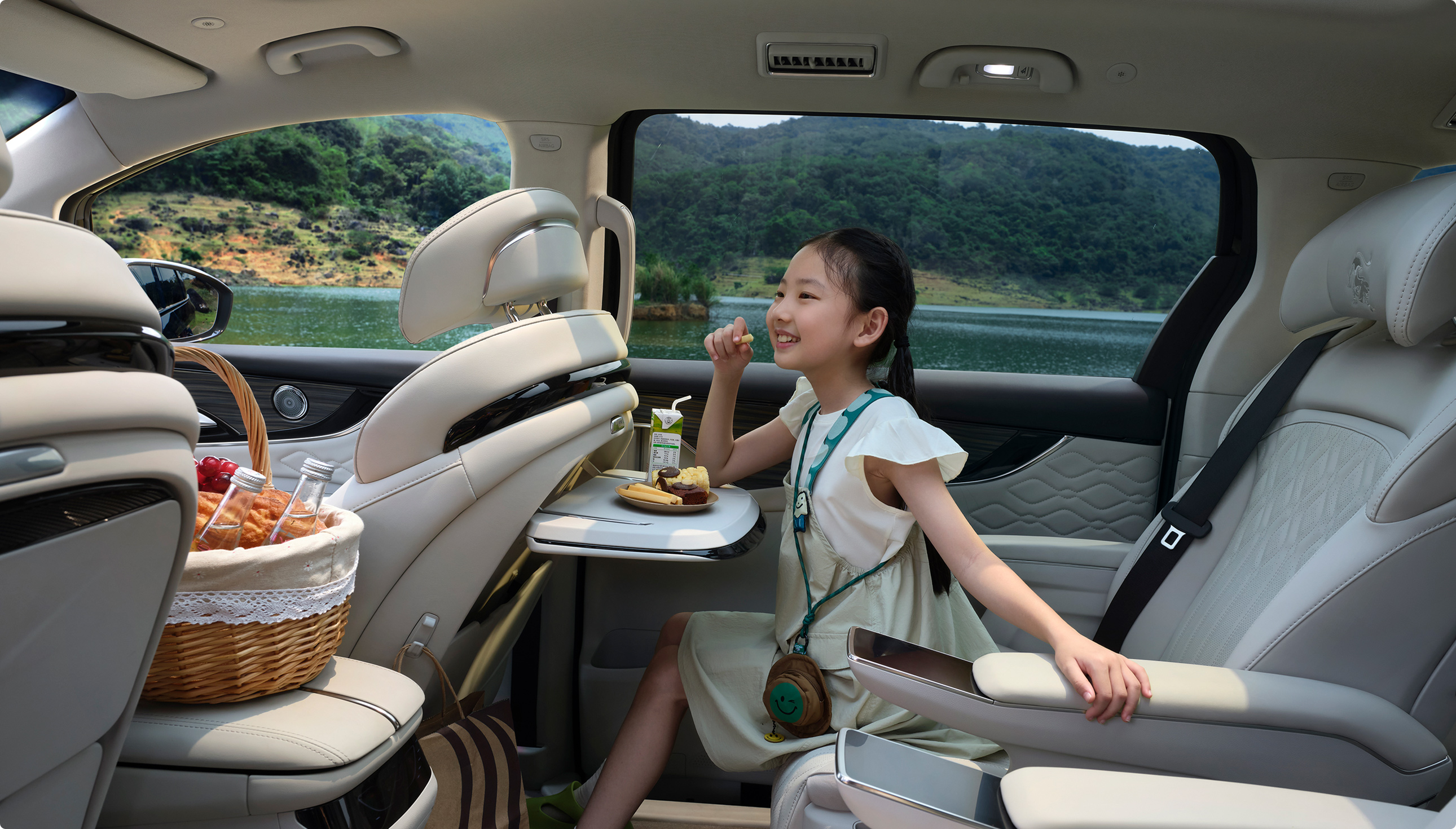 二三排座椅可实现接平,形成全平沙发床,打造孩子们的移动童趣小天地。
