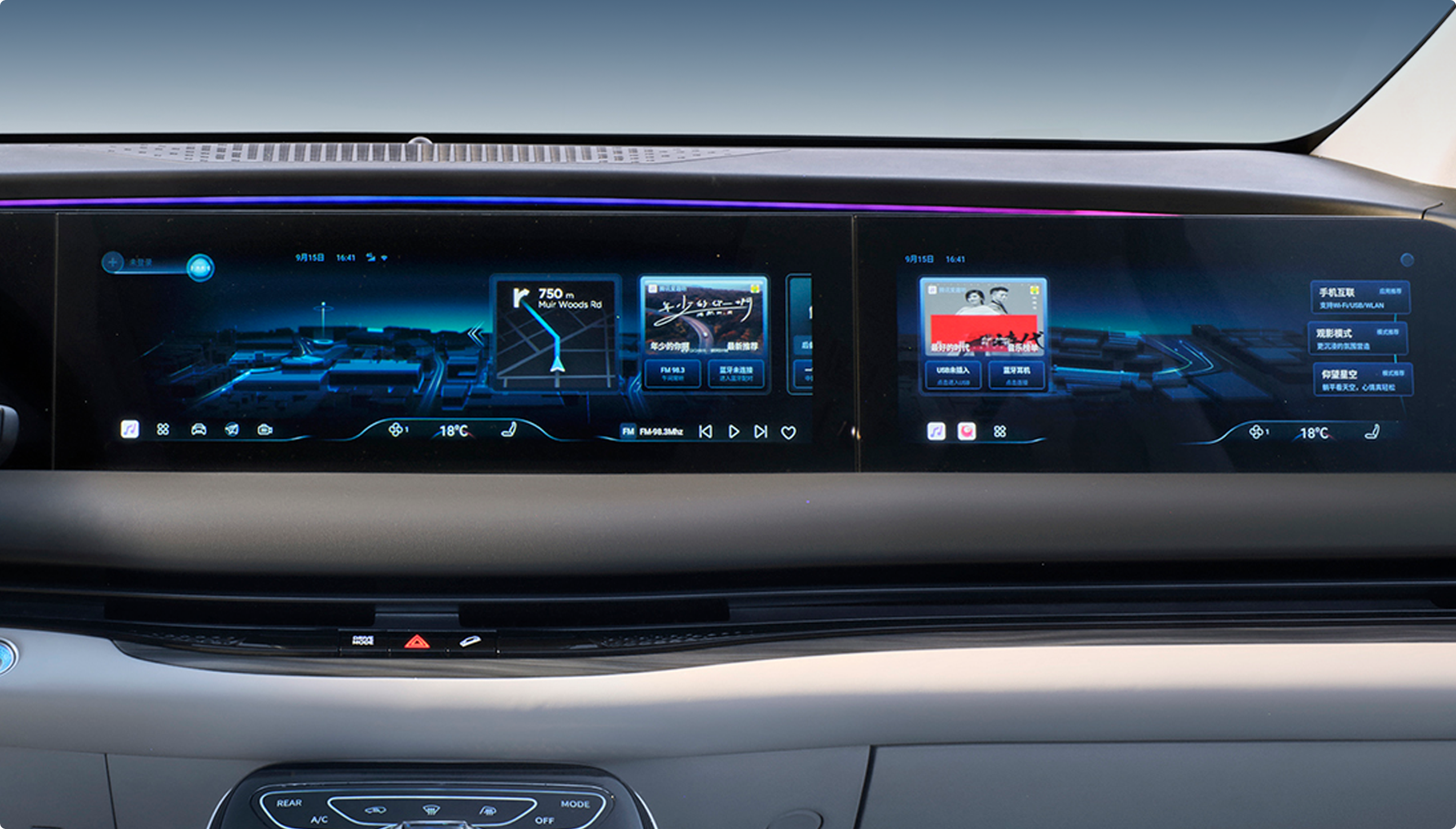 中间16.2英寸触控液晶屏, 2608*720高清屏,支持UI操作、语音识别,多种场景模式;